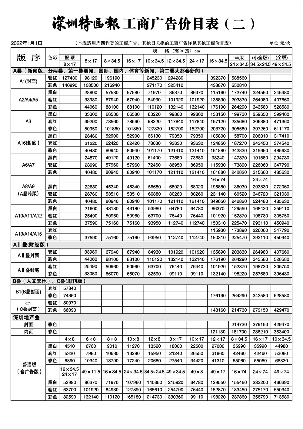 深圳特區(qū)報(bào)工商廣告價目表