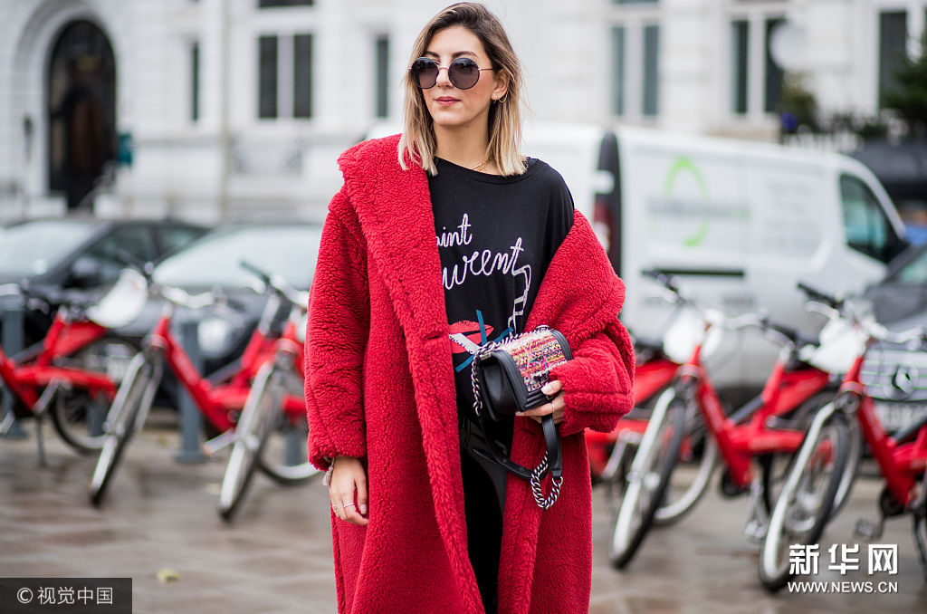 ??? 當(dāng)?shù)貢r(shí)間2017年12月5日,德國(guó)漢堡,時(shí)尚博主Aylin Koenig街拍。她戴Dolce & Gabbana黑色圓框墨鏡,身穿Max Mara紅色羊羔毛大衣,內(nèi)搭Saint Laurent黑色字母紅唇印花衛(wèi)衣,手拎Chanel粗呢拼接鏈條包,下穿Asos黑色漆皮緊身皮褲,腳踩Valentino黑色金屬釘鑲嵌系帶短靴。