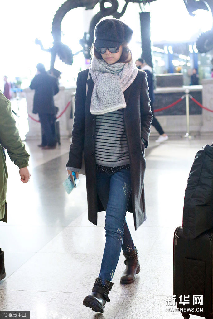 ??? 北京,近日,林心如現(xiàn)身首都機(jī)場。 林心如頭戴灰色毛呢報童帽,黑色太陽鏡遮面,身穿黑色毛呢修身毛呢大衣外套,脖帶淺灰色針織圍脖,內(nèi)搭條紋T恤,肩背白色Herems凱莉包,下穿深藍(lán)色磨白緊身牛仔褲,腳穿鉚釘平底踝靴。