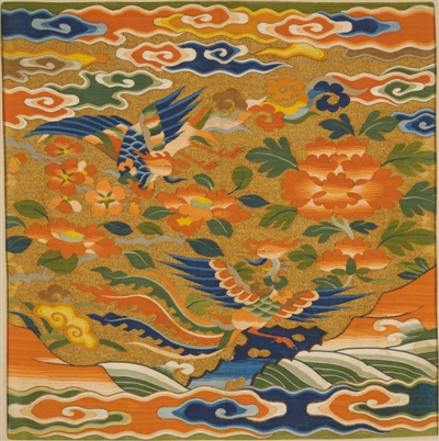 鸞鳳與牡丹、湖石、祥云相配稱“鳳穿牡丹”或“鳳戲(喜)牡丹”,佳節(jié)初歲時寓意四季平安、富貴吉祥。而成對出現(xiàn)的鳳凰與花卉又有贊頌夫婦恩愛、富貴白頭之意?,F(xiàn)藏美國大都會博物館的明人緙絲鳳穿牡丹方補(bǔ)原綴明代內(nèi)命婦吉服,穿用于慶典朝會。方補(bǔ)中一對緙絲彩鳳被安置在山花樹石佳景之中,叢生的靈芝、山茶、梅花、牡丹皆有吉祥寓意。這樣題材的緙絲補(bǔ)子亦見清華大學(xué)藝術(shù)館藏,可見在明代使用富有節(jié)慶特色的補(bǔ)子頗為常見。