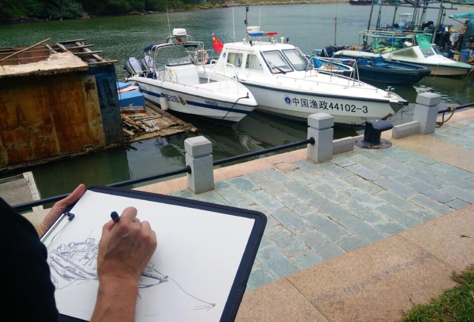 優(yōu)美的景色映入畫家們眼簾,點燃了他們的創(chuàng)作激情。來到鹽田之后,藝術家們紛紛找好寫生地點,擺好畫架,迅速進入創(chuàng)作的狀態(tài)。他們當中一部分來到了鹽田漁港,鹽田海鮮街后的小漁村避風港。蔚藍的大海、旁邊的綠樹、避風塘內(nèi)停泊的船只、白色的海鳥、釣魚的人以及遠方火熱的建設場景都呈現(xiàn)在畫家的筆端;另一部分藝術家來到了位于三洲田深圳會計進修學院的梧桐溪谷,小橋流水人家、奇石山林則一一被傾注于畫紙。