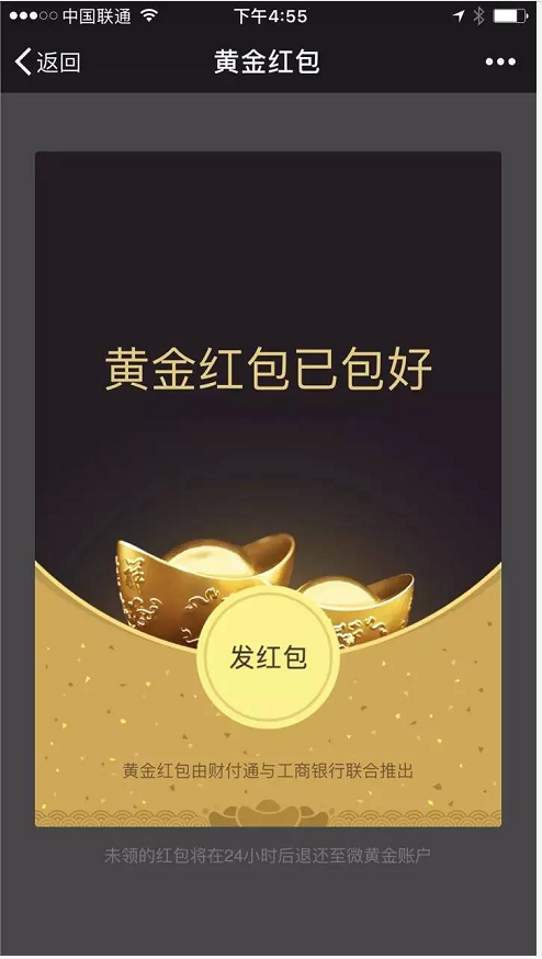 如果黃金紅包包好后未發(fā)送或未被領(lǐng)取,24小時后會自動退回到發(fā)送用戶微黃金賬戶