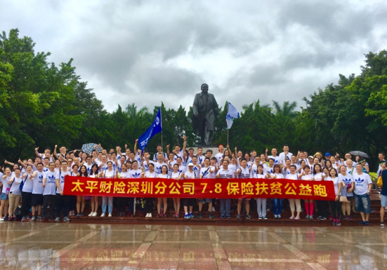 活動(dòng)期間,深圳分公司積極組織員工參加公益跑活動(dòng),每日捐贈(zèng)里程。7月8日當(dāng)天,深圳分公司特別組織公司數(shù)百名員工至蓮花山公園開展“7.8公里扶貧公益跑”活動(dòng),縱使天降驟雨依然抵擋不住太平員工踐行公益的熱情,為雨中的公園增添了一道靚麗的“太平彩虹”。