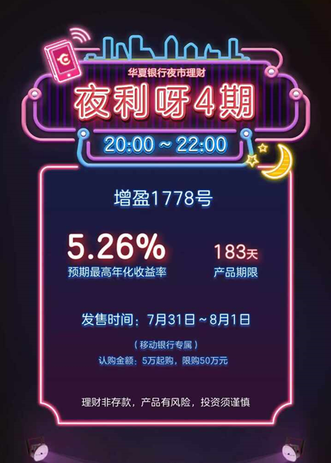 “夜市理財”是華夏銀行夜間發(fā)售的理財產(chǎn)品,投資者需要通過手機銀行等在線渠道購買。推出理財夜市,使朝九晚五的上班族,避免了錯失購買緊俏銀行理財產(chǎn)品的時機。