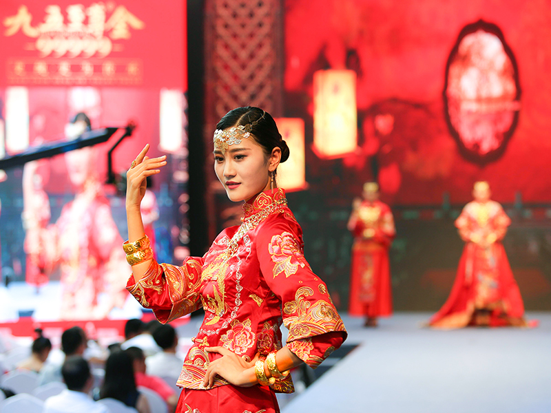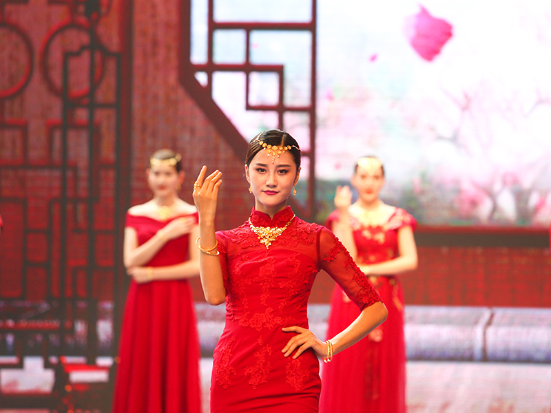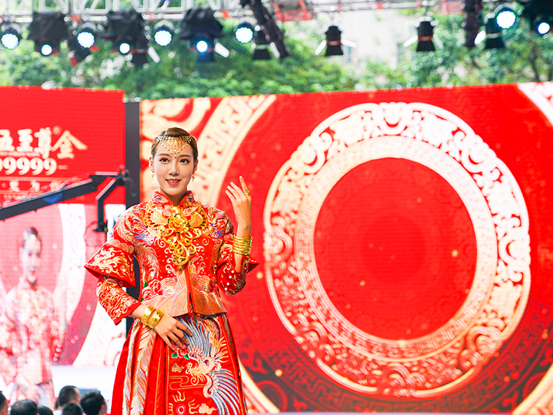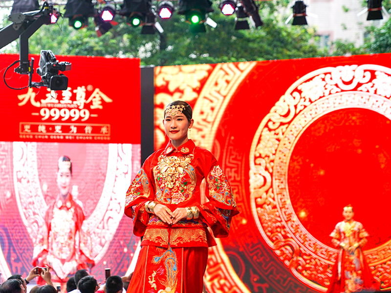 黃金文化與中國傳統(tǒng)婚慶文化淵源久遠,從古自今,黃金有情比金堅之意,有滿滿的喜慶之感,在嫁娶之時通常作為聘禮中的重頭戲。結(jié)婚三金通常指的是項鏈、手鐲、戒指,寓意夫妻情比金堅,一生一世永相隨之意,因此這美好的寄愿習俗一直被傳承至今。黃金又是財富、身份的象征,結(jié)婚佩戴黃金首飾,彰顯家族的財富、地位與榮譽,飽含家族人濃郁的情感與欣喜,可代代傳承!九五至尊金至囍新娘演繹的中華黃金婚慶文化,唯美唯俏,牽動著每個人的心,掀起了中華黃金婚慶文化的熱潮。