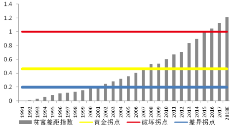 研究發(fā)現(xiàn),貧富差距指數(shù)與經(jīng)濟(jì)發(fā)展存在這三個(gè)拐點(diǎn):差異拐點(diǎn)(0.2)、黃金拐點(diǎn)(0.463)及破壞拐點(diǎn)(1)。當(dāng)貧富差距指數(shù)在0.2以下的低值區(qū)時(shí),絕對(duì)平均造成動(dòng)力不足。當(dāng)貧富差距指數(shù)高于0.2時(shí),差異的動(dòng)力效應(yīng)開(kāi)始顯現(xiàn),貧富差距指數(shù)與GDP增長(zhǎng)率存在顯著的倒U型的非線(xiàn)性關(guān)系。而且拐點(diǎn)在貧富差距指數(shù)等于0.463左右,對(duì)應(yīng)的時(shí)間為2006-2007年之間,貧富差距在這個(gè)水平左右對(duì)經(jīng)濟(jì)增長(zhǎng)的動(dòng)力效應(yīng)最高。當(dāng)貧富差距指數(shù)低于1時(shí),貧富差距處于合理狀態(tài),合理的貧富差距提高了居民的工作動(dòng)能,有利于促進(jìn)經(jīng)濟(jì)增長(zhǎng),但超過(guò)臨界值1,隨著貧富差距進(jìn)一步提高,貧窮人口會(huì)有日益強(qiáng)烈的被剝削感,在一定程度上抑制了經(jīng)濟(jì)總量的提升。據(jù)此,近年來(lái)我國(guó)貧富差距的演變過(guò)程可以分為四大階段,分別是“財(cái)富絕對(duì)平均階段”(1991-2001年)、“差異帶來(lái)動(dòng)力,逐步接近黃金拐點(diǎn)階段”(2001-2007年)、“貧富差異擴(kuò)大階段”(2007-2015年)及“貧富分化相對(duì)嚴(yán)重階段”(2015年至今)。經(jīng)研究團(tuán)隊(duì)測(cè)算,2018年貧富差距指數(shù)預(yù)計(jì)已超過(guò)破壞拐點(diǎn)。