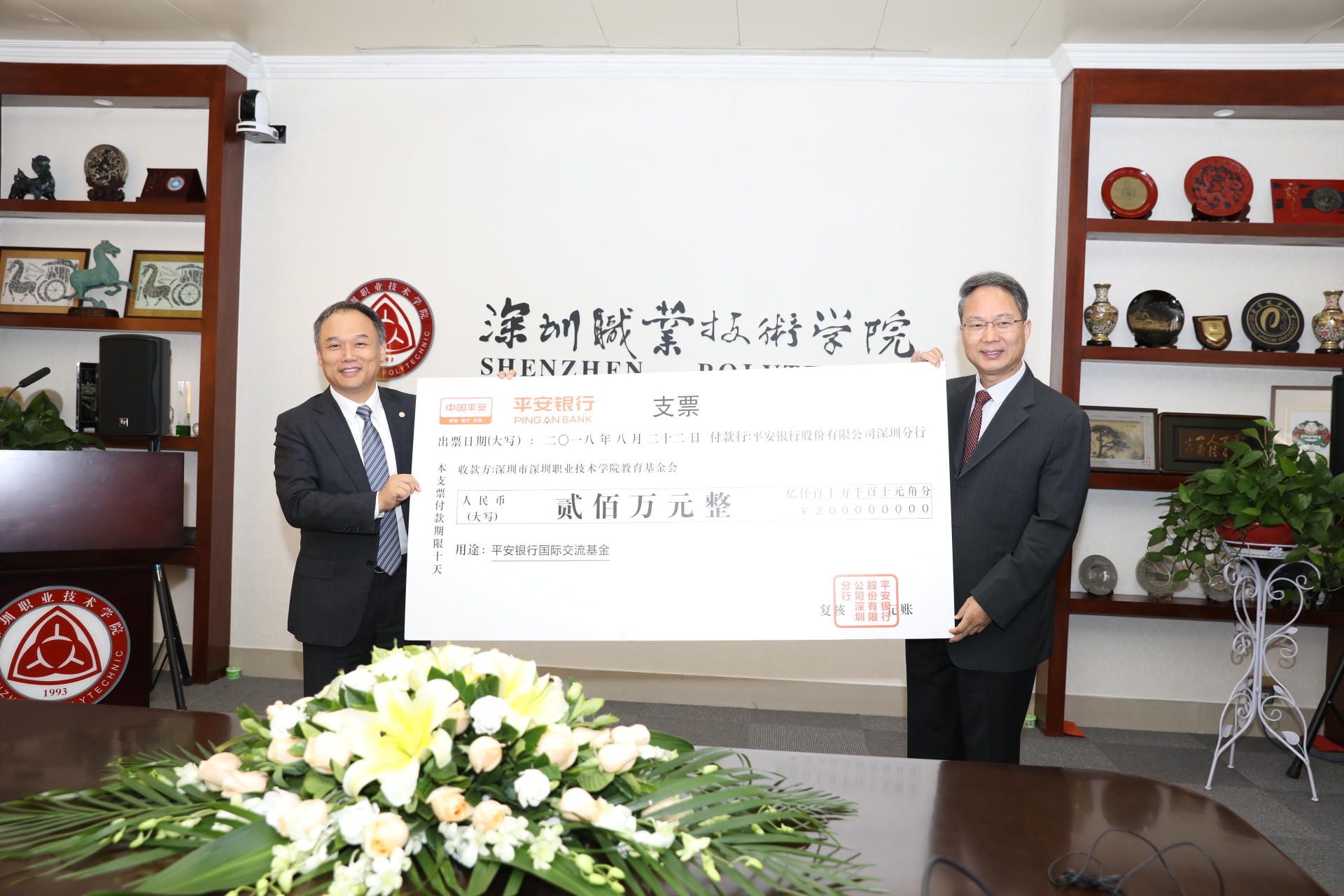 2018年11月22日,平安銀行與深圳職業(yè)技術學院校園一卡通項目交付儀式暨國際交流基金捐贈儀式在深圳職業(yè)技術學院101會議室隆重舉行。平安銀行行長助理、深圳分行楊志群行長、孫芳滔副行長、陳宏敬副行長、高寒竹零售總監(jiān),深圳職業(yè)技術學院陳秋明黨委書記、唐曉鳴副校長、董朝君副校長等領導出席了儀式。