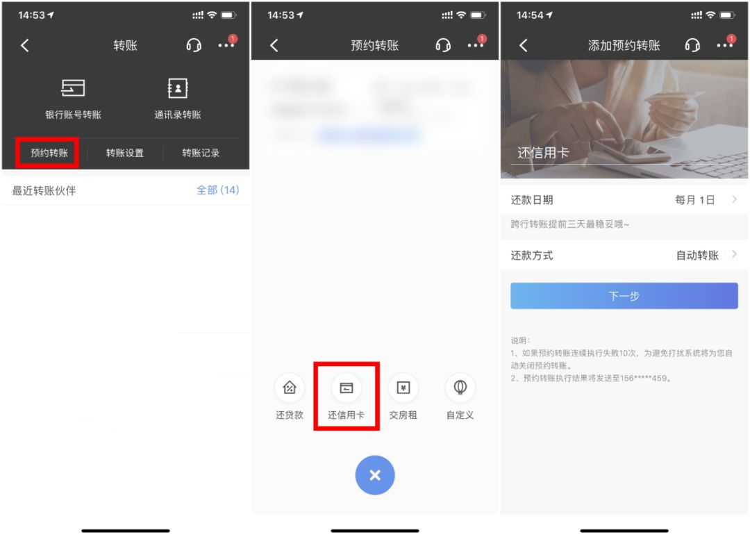 在轉(zhuǎn)賬頁(yè)面點(diǎn)擊“預(yù)約轉(zhuǎn)賬”,選擇“還信用卡”。根據(jù)提示選擇日期、方式等,每月即可收到還款提醒,媽媽再也不用擔(dān)心我的信用卡逾期了!