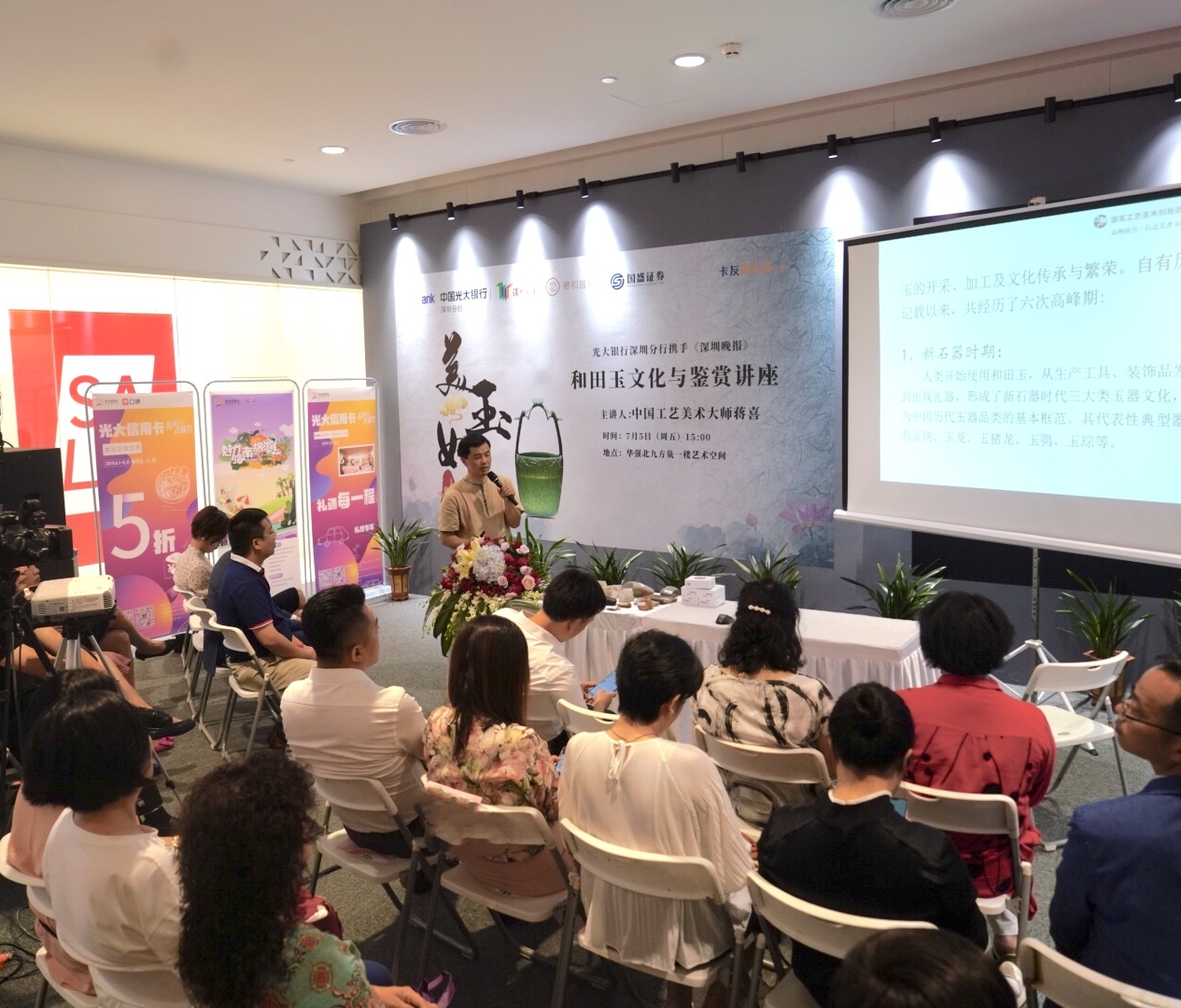 在講座中,蔣喜先生圍繞美玉初探;師古而不擬古——貴在創(chuàng)新等內(nèi)容進行了分享,對當代玉雕創(chuàng)作中的師古與創(chuàng)新進行了深入淺出的講解,讓現(xiàn)場嘉賓獲益匪淺。在講座現(xiàn)場,光大銀行深圳分行的工作人員為到場嘉賓介紹了個人理財、私行業(yè)務、出國金融、信用卡業(yè)務等多個產(chǎn)品業(yè)務,讓聽眾對光大銀行金融產(chǎn)品有了更深入的了解。