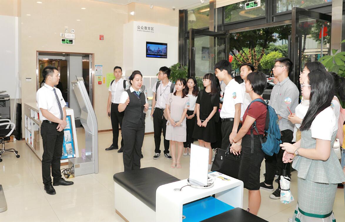 開放日活動的第二站,同學(xué)們來到沙井支行營業(yè)部、沙井坣崗支行和福田支行營業(yè)部學(xué)習(xí)了銀行營業(yè)網(wǎng)點(diǎn)功能區(qū)布局、窗口設(shè)置、營業(yè)場所裝飾、智能設(shè)備配置及人員安排等情況,對銀行營業(yè)網(wǎng)點(diǎn)的工作環(huán)境有了更直觀的感受和體驗(yàn)。特別是在參觀沙井東塘支行的員工宿舍“職工之家”時,同學(xué)們對這個占地1500平米、總建筑面積3200平米的獨(dú)立大院由衷贊嘆,向往不已。