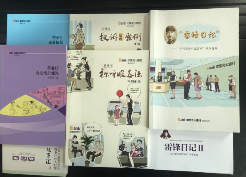 光大銀行深圳分行在組織開展上述活動中發(fā)現(xiàn),一線員工用樸素的文字記述著服務(wù)客戶的點滴事例,詮釋著對優(yōu)質(zhì)服務(wù)的理解和追求,弘揚著具有光大特色的家園文化、陽光文化,字里行間飽含著對光大事業(yè)的忠誠和熱愛,看到了員工中蘊含著巨大的工作熱情和創(chuàng)造力。為更好鼓勵員工積極性,在深圳分行領(lǐng)導(dǎo)支持下,深圳分行陽光服務(wù)辦每年將員工發(fā)表的案例進行認真篩選編輯,署上員工姓名,聘請專業(yè)美術(shù)人員配圖插畫,再印制成精美的書籍,供大家日常學(xué)習(xí)和收藏。從2013年開始至2019年的7年間,深圳分行先后將員工發(fā)表的文章案例印制了《廳堂服務(wù)情景案例》、《營業(yè)廳突發(fā)情景處置案例匯編》、《營業(yè)廳好人好事故事匯》、《投訴處理案例》、《稱呼服務(wù)法》、《雷鋒日記-學(xué)寫雷鋒日記活動故事選編》、《雷鋒日記II-學(xué)寫雷鋒日記活動故事選編》共計7本書籍。