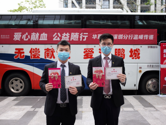 華夏銀行深圳分行行領導先后看望、慰問獻血員工。深圳市血液中心向華夏銀行深圳分行頒授感謝獎牌,深圳分行孫海強副行長代表分行向血液中心捐贈1000只口罩。