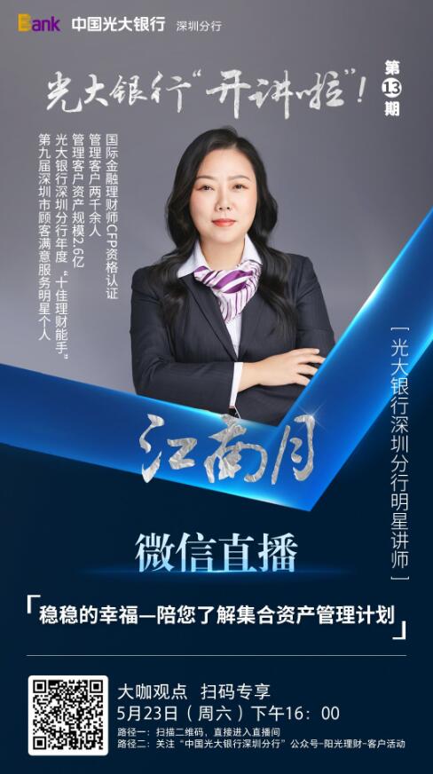 此次,光大銀行深圳分行攜手《深圳晚報》邀請CFP資格認證國際金融理財師、該行年度“十佳理財能手”、明星講師江南月帶來《穩(wěn)穩(wěn)的幸福——陪您了解集合資產(chǎn)管理計劃》主題分享,幫助更多客戶深入了解并購買集合資產(chǎn)管理計劃產(chǎn)品。講師江南月將從集合資產(chǎn)管理計劃的基本概念和產(chǎn)品優(yōu)勢出發(fā),深入淺出,讓更多客戶了解集合資產(chǎn)管理計劃產(chǎn)品,并幫助客戶選擇購買這類產(chǎn)品。該行代銷的純債類集合資產(chǎn)管理計劃一直以來都以穩(wěn)健著稱,目前已到期產(chǎn)品全部達到了業(yè)績比較基準,設置超額收益的產(chǎn)品也都為客戶實現(xiàn)了超額回報。