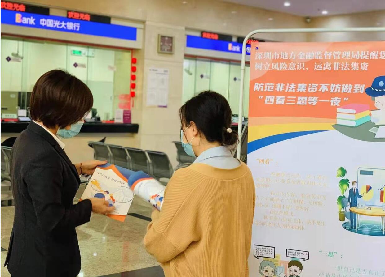 在活動開展期間,光大銀行深圳分行在網(wǎng)點擺放了防范非法集資的宣傳展架,并向前來辦理業(yè)務(wù)的市民主動發(fā)放防范非法集資宣傳手冊。宣傳冊上詳細介紹了非法集資相關(guān)的金融知識,包括非法集資的特征、表現(xiàn)形式和常見手段,摘錄了相關(guān)的法律法規(guī)和政策,用非法集資案例生動形象的說明危險就在身邊。該行網(wǎng)點員工還針對客戶提出的疑問給予詳細講解,并提醒客戶,遠離非法集資,守好自己的“錢袋子”。