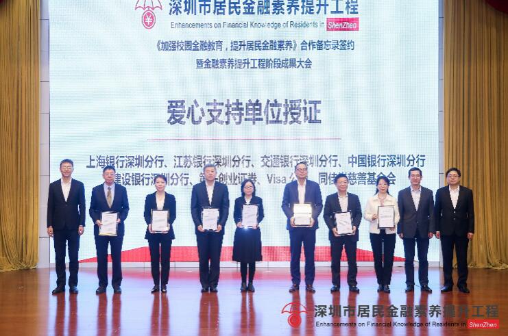 在隨后的授證儀式中,上海銀行深圳分行因?qū)ι钲谑芯用窠鹑谒仞B(yǎng)提升工程做出的突出貢獻(xiàn),及推動(dòng)深圳金融安全建設(shè)與可持續(xù)發(fā)展,被授予了“愛心支持單位”榮譽(yù)稱號(hào)。