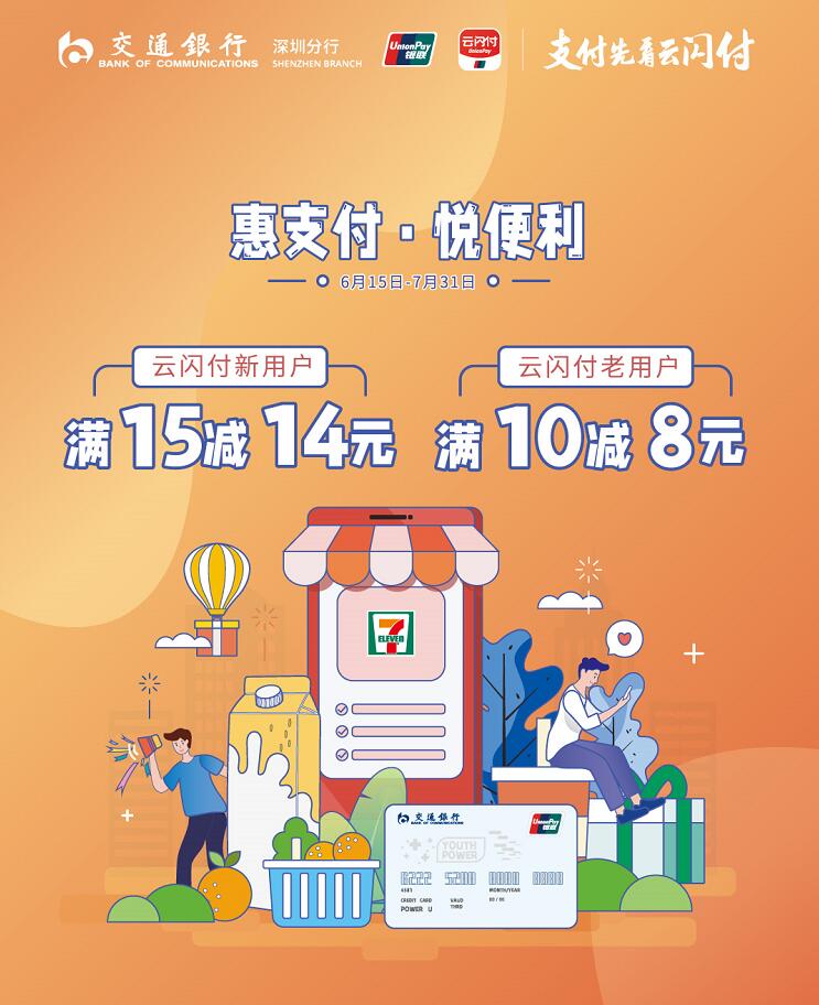 近日,交通銀行深圳分行、云閃付、7-Eleven攜手開展“惠支付,悅便利”活動,在7-Eleven用銀聯(lián)二維碼支付享立減優(yōu)惠。