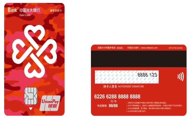在金融服務(wù)產(chǎn)品方面,光大銀行面向軍人、退役軍人發(fā)行“擁軍優(yōu)撫”專(zhuān)屬聯(lián)名卡,優(yōu)撫對(duì)象可以憑軍官證、士兵證、退役證等有效證件在該行營(yíng)業(yè)網(wǎng)點(diǎn)柜臺(tái)辦理賬戶開(kāi)立并免收卡片工本費(fèi),“擁軍優(yōu)撫”專(zhuān)屬銀行卡在全國(guó)統(tǒng)一實(shí)現(xiàn)兩個(gè)專(zhuān)屬服務(wù)和十項(xiàng)優(yōu)惠政策。