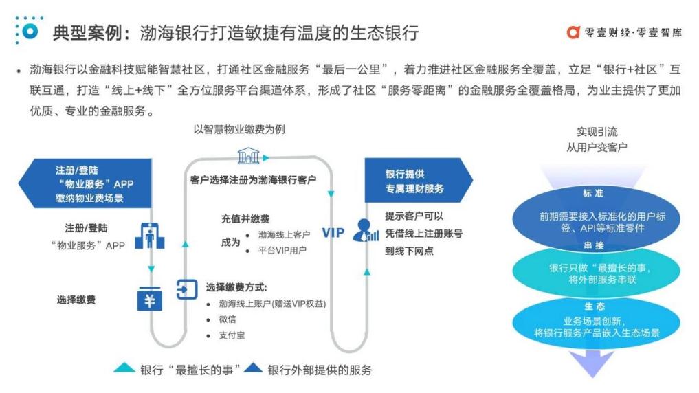 以此次該行入圍行業(yè)權(quán)威報告的“智慧物業(yè)”金融科技創(chuàng)新服務(wù)項目為例,渤海銀行創(chuàng)新業(yè)務(wù)場景——繳納物業(yè)費場景,社區(qū)居民通過“物業(yè)服務(wù)APP”繳納物業(yè)費時,可以選擇渤海銀行線上賬戶為付費方式,當(dāng)用戶充值并繳費后,便同時成為了渤海銀行線上客戶和平臺V IP,并享受銀行提供的專屬理財服務(wù)。通過將自身服務(wù)產(chǎn)品嵌入“物業(yè)服務(wù)”A PP,只做“最擅長的事,渤海銀行將外部服務(wù)串聯(lián)”,最終實現(xiàn)A PP用戶到自身客戶的轉(zhuǎn)變。