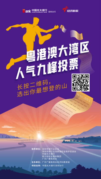 近日,“2021粵港澳大灣區(qū)全民登高系列賽”已經(jīng)進(jìn)入啟動(dòng)階段,現(xiàn)已在網(wǎng)上發(fā)起粵港澳大灣區(qū)人氣九峰的投票,通過各大網(wǎng)友從29座粵港澳大灣區(qū)山峰中票選出九座人氣最高的山峰,作為本次全民登高系列賽線上賽的主要場地,并在其中一座山峰舉行線下賽事活動(dòng)。廣大市民朋友可通過掃描圖中二維碼進(jìn)行投票。