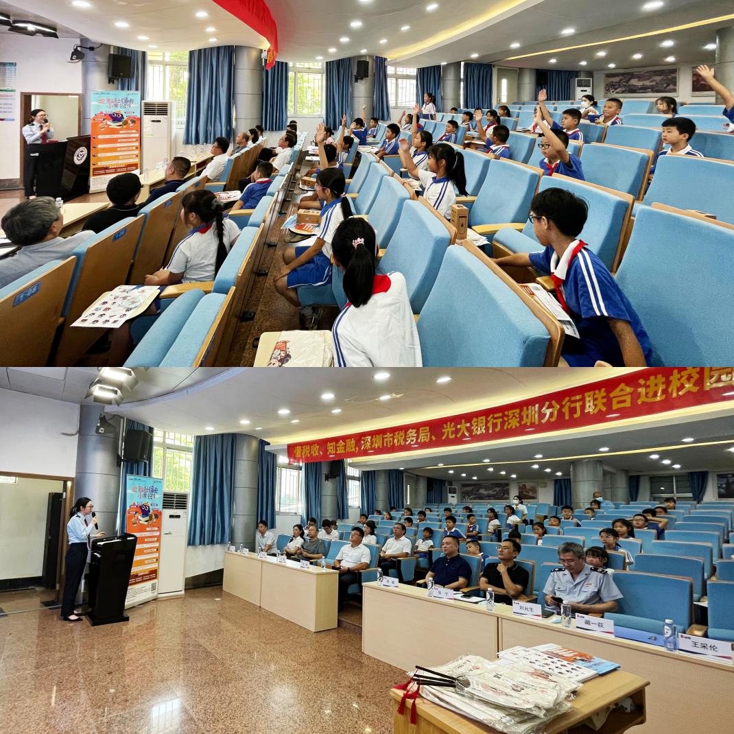 此次活動(dòng)深圳市稅務(wù)局黨委與光大銀行深圳分行黨委高度重視,光大銀行深圳分行副行長(zhǎng)、黨委委員宋綱、深圳市稅務(wù)局社會(huì)保險(xiǎn)費(fèi)處處長(zhǎng)高鵬出席活動(dòng),旨在以2021-2022年度少兒醫(yī)保征收為契機(jī),讓孩子們從小培養(yǎng)依法納稅、自覺參保意識(shí),同時(shí)普及金融知識(shí),關(guān)注青少年思想道德教育,提升金融安全防范意識(shí),履行社會(huì)責(zé)任?;顒?dòng)前,光大銀行深圳分行副行長(zhǎng)宋綱、深圳市稅務(wù)局社會(huì)保險(xiǎn)費(fèi)處處長(zhǎng)高鵬分別對(duì)青少年送出了寄語,希望通過銀、稅、校合作,建立社保、金融知識(shí)傳輸通道,讓孩子們將稅務(wù)、社保、金融知識(shí)帶回家。