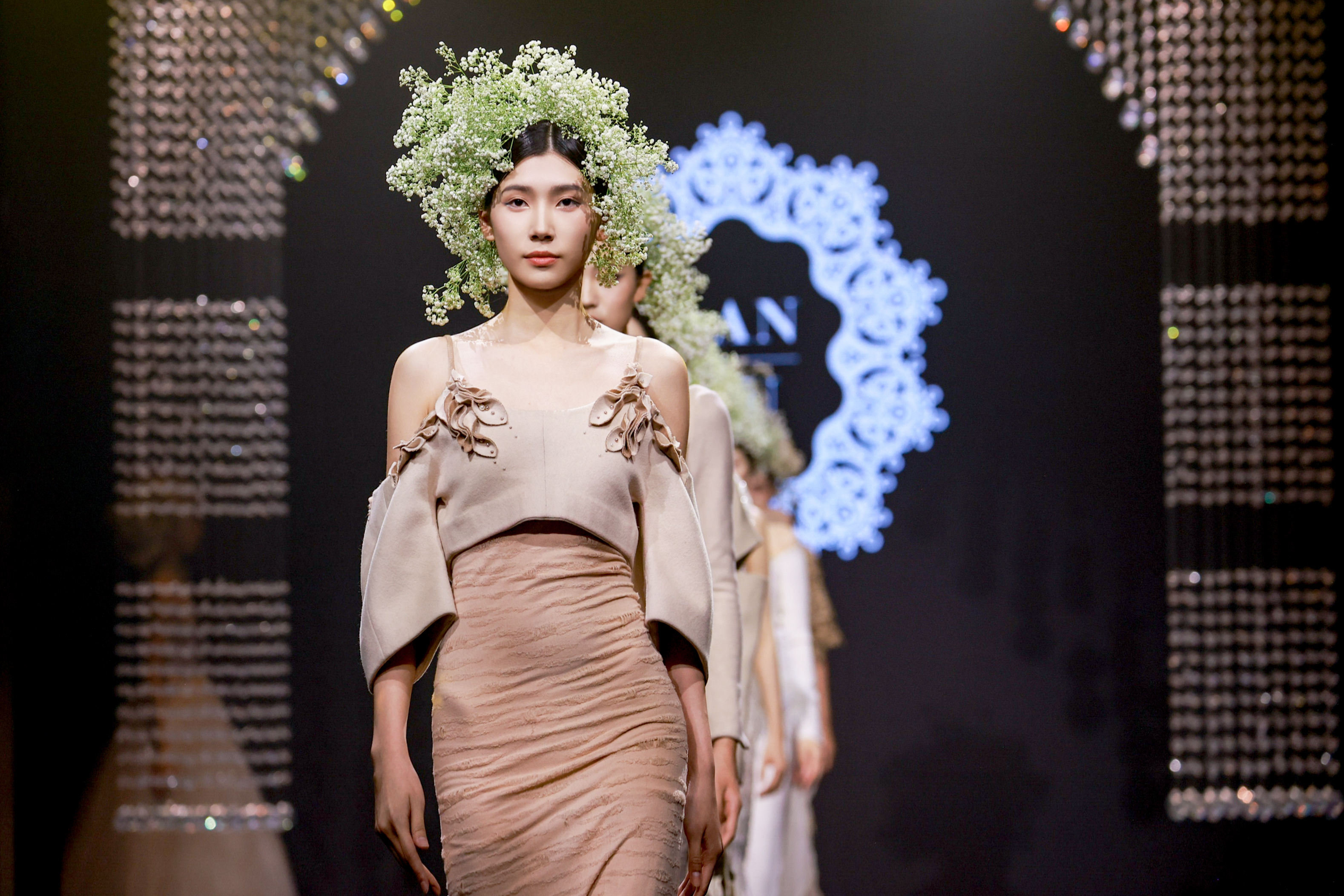 現(xiàn)場更有LANYU高定禮服展示,將中式美學意境與西式時尚剪裁完美融合,同時加重了蘇繡非遺元素的應用比例,將更多的非遺技藝融入服飾創(chuàng)作中,呈現(xiàn)出超高藝術水準。