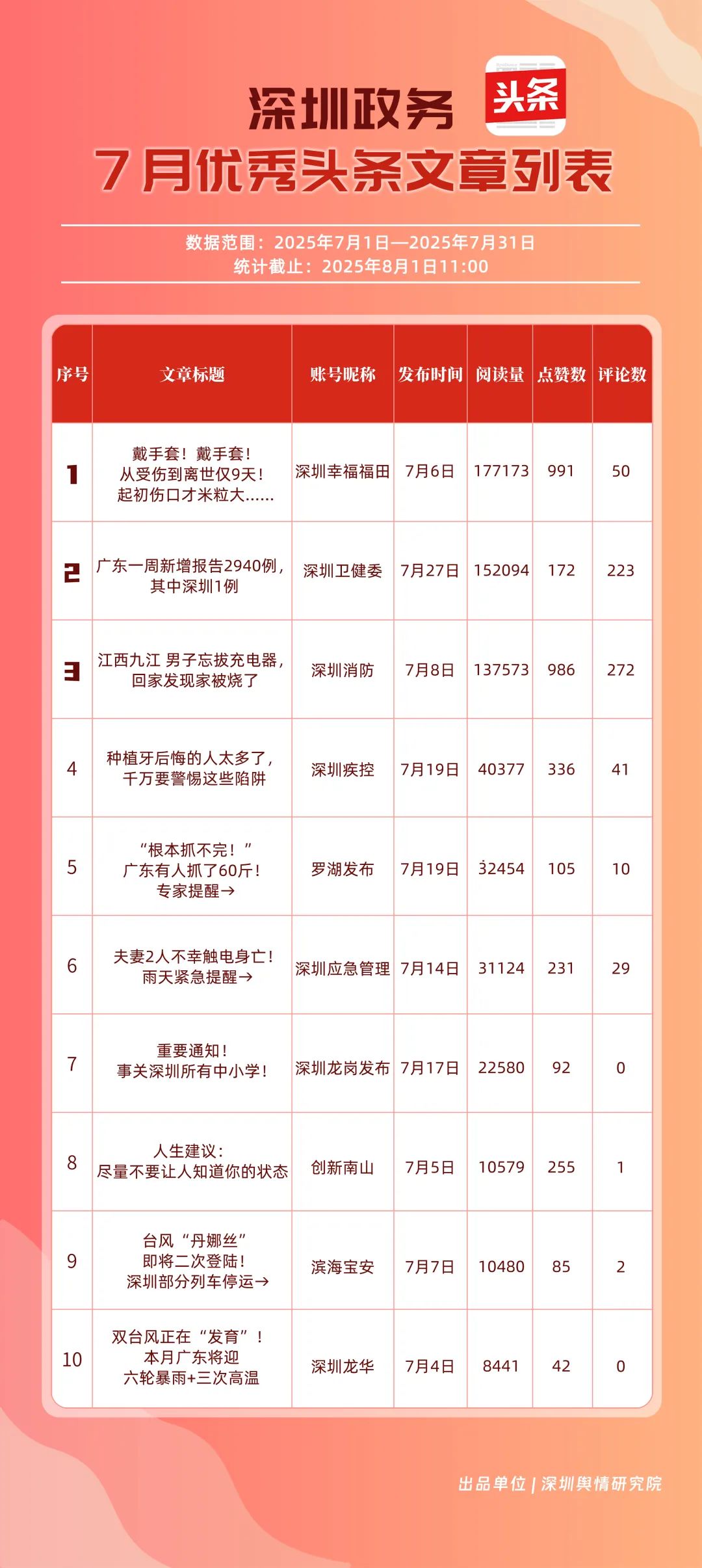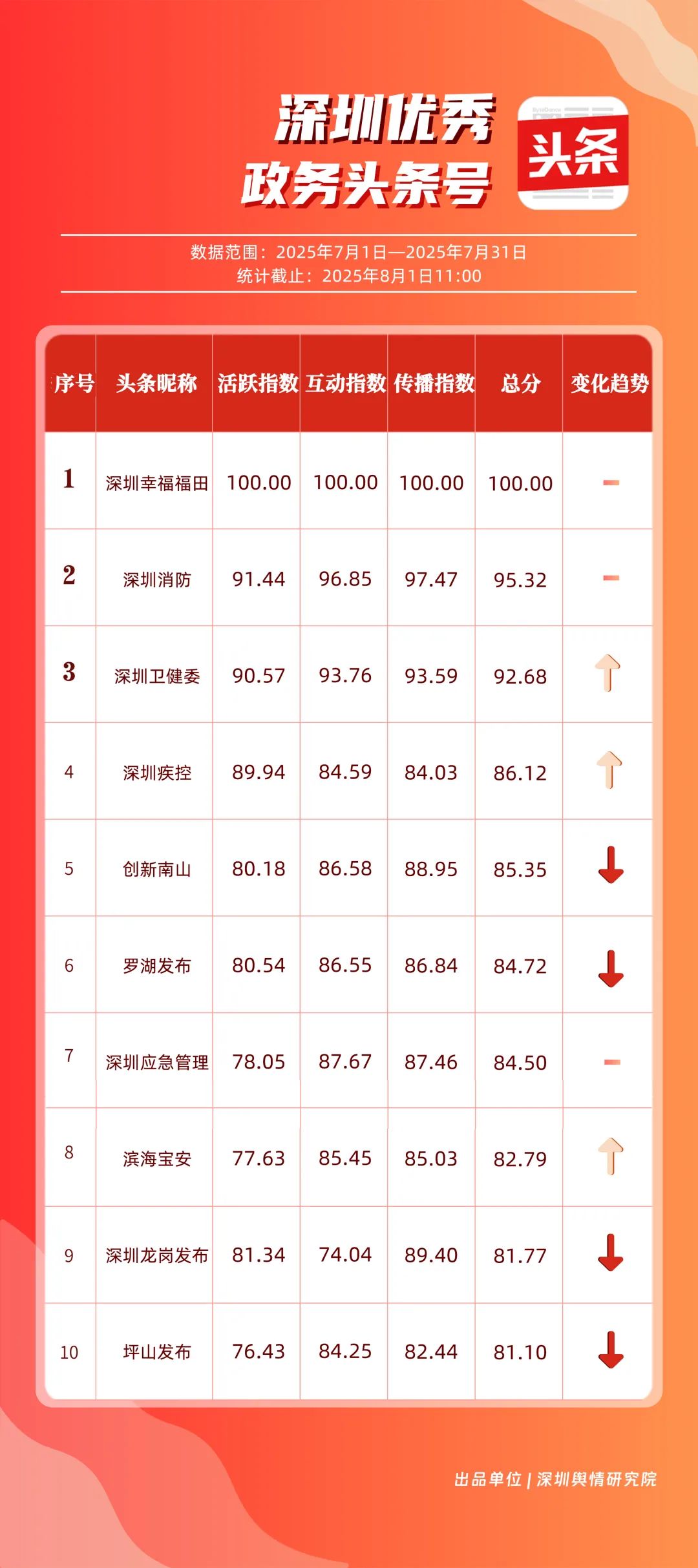 7月,“深圳幸福福田”“深圳消防”“深圳衛(wèi)健委”“深圳疾控”“創(chuàng)新南山”“羅湖發(fā)布”“深圳應(yīng)急管理”“濱海寶安”“深圳龍崗發(fā)布”“坪山發(fā)布”共10個(gè)政務(wù)頭條號(hào)入選“優(yōu)秀政務(wù)頭條號(hào)”榜單?!吧钲谛腋8L铩薄吧钲谙馈睉{借優(yōu)質(zhì)內(nèi)容持續(xù)吸引用戶關(guān)注,穩(wěn)居前二;“深圳衛(wèi)健委”表現(xiàn)亮眼,評(píng)分達(dá)92.68分,排名較6月有所上升;“深圳疾控”同樣進(jìn)步明顯,在疾病預(yù)防控制信息傳播上發(fā)揮了重要作用?!皠?chuàng)新南山”“羅湖發(fā)布”“深圳應(yīng)急管理”等上榜賬號(hào),也各展所長(zhǎng),始終將優(yōu)質(zhì)內(nèi)容作為核心抓手,成為政務(wù)新媒體領(lǐng)域內(nèi)容創(chuàng)作與傳播的典范。