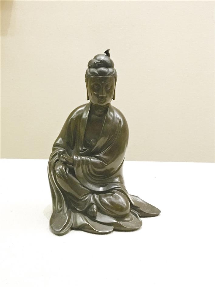其中,最引人注目的莫過(guò)于展覽海報(bào)上呈現(xiàn)的“景德鎮(zhèn)白釉瓷塑觀音菩薩像”,產(chǎn)于南宋時(shí)期,整尊瓷塑構(gòu)思既簡(jiǎn)約又精巧,以粗線條捏塑形體與衣紋,胸前瓔珞精致,人物形象傳神,充分展現(xiàn)了宋代瓷塑藝術(shù)的審美意韻與高超技藝。令人嘖嘖稱贊的還有明中晚期的“銅觀音菩薩像”。此像采用暹羅國(guó)(今泰國(guó))所貢優(yōu)質(zhì)風(fēng)磨銅鑄造,工藝精細(xì),撫之如嬰兒肌膚,嵌銀絲,背后銀絲鑲嵌方章銘款“石叟”二字,當(dāng)出自石叟本人之手。據(jù)了解,石叟為明代晚期鑄銅塑像名匠,僧人身份,現(xiàn)存中晚明觀音銅像中尚有部分“石叟”款,真品珍貴稀罕。