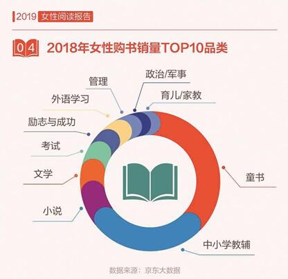 京東大數(shù)據(jù)顯示,女性的讀書量顯著提升,2018年,女性讀者人均購(gòu)書7.6本,高于男性,女性讀者在紙質(zhì)書購(gòu)買上的人均消費(fèi)近230元,女性的“閱讀力”正在變得越來越強(qiáng)。從圖書銷量上看,2018年女性讀者購(gòu)買最多的圖書是童書、中小學(xué)教輔、小說、文學(xué)和考試,可見對(duì)于大部分女性而言,購(gòu)書的主要目的是出于育兒的需求。