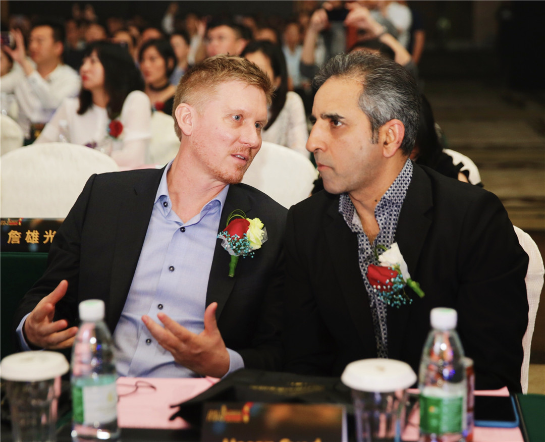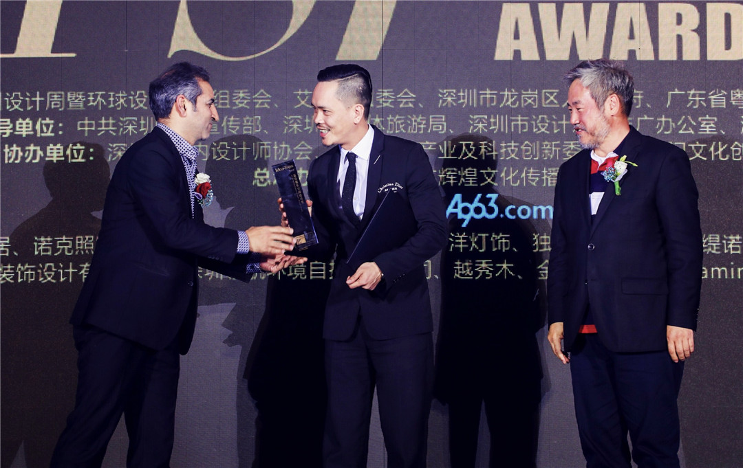 △中央美術(shù)學(xué)院建筑設(shè)計(jì)研究院院長(zhǎng)、博士生導(dǎo)師王鐵,美國(guó)Gensler上海公司總監(jiān)Hasan Syed為廣州設(shè)計(jì)師黃永才頒發(fā)“最佳娛樂空間設(shè)計(jì)獎(jiǎng)”