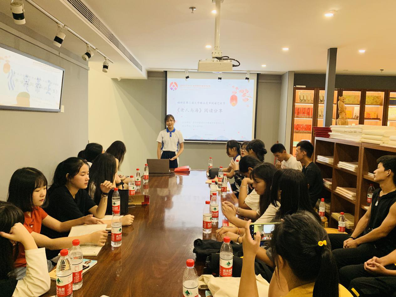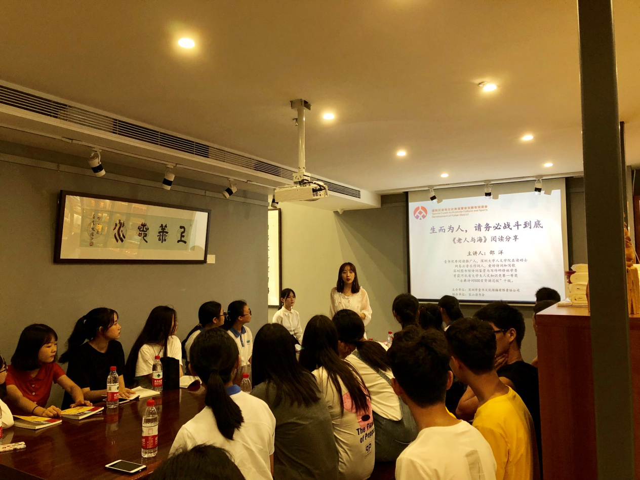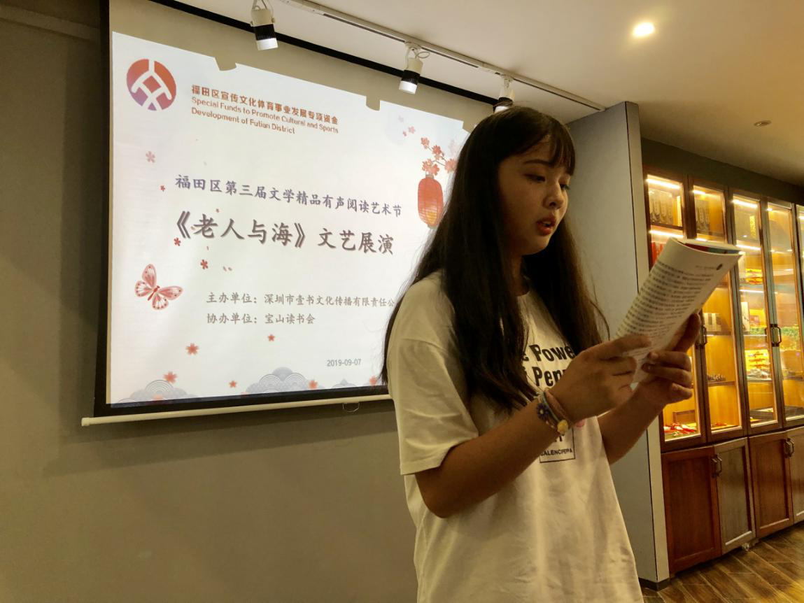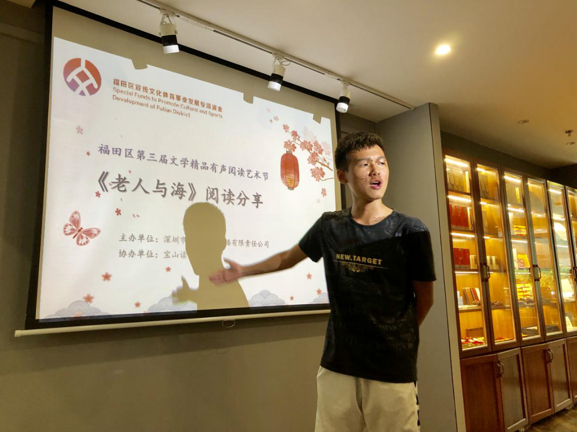 深圳新聞網(wǎng)訊 2019年9月7日,由深圳市壹書文化傳播有限責(zé)任公司主辦、寶山讀書會(huì)協(xié)辦的“福田區(qū)第三屆文學(xué)精品有聲閱讀藝術(shù)節(jié)”之《老人與?!烽喿x分享會(huì)暨文學(xué)作品朗誦會(huì)在簡閱書吧香蜜湖店成功舉辦。來自深圳市寶山技工學(xué)校的學(xué)子們在主講人的啟示下分享閱讀感悟、誦讀精彩文摘,在文藝展演中體會(huì)圣地亞哥抗擊命運(yùn)的人生哲學(xué)。