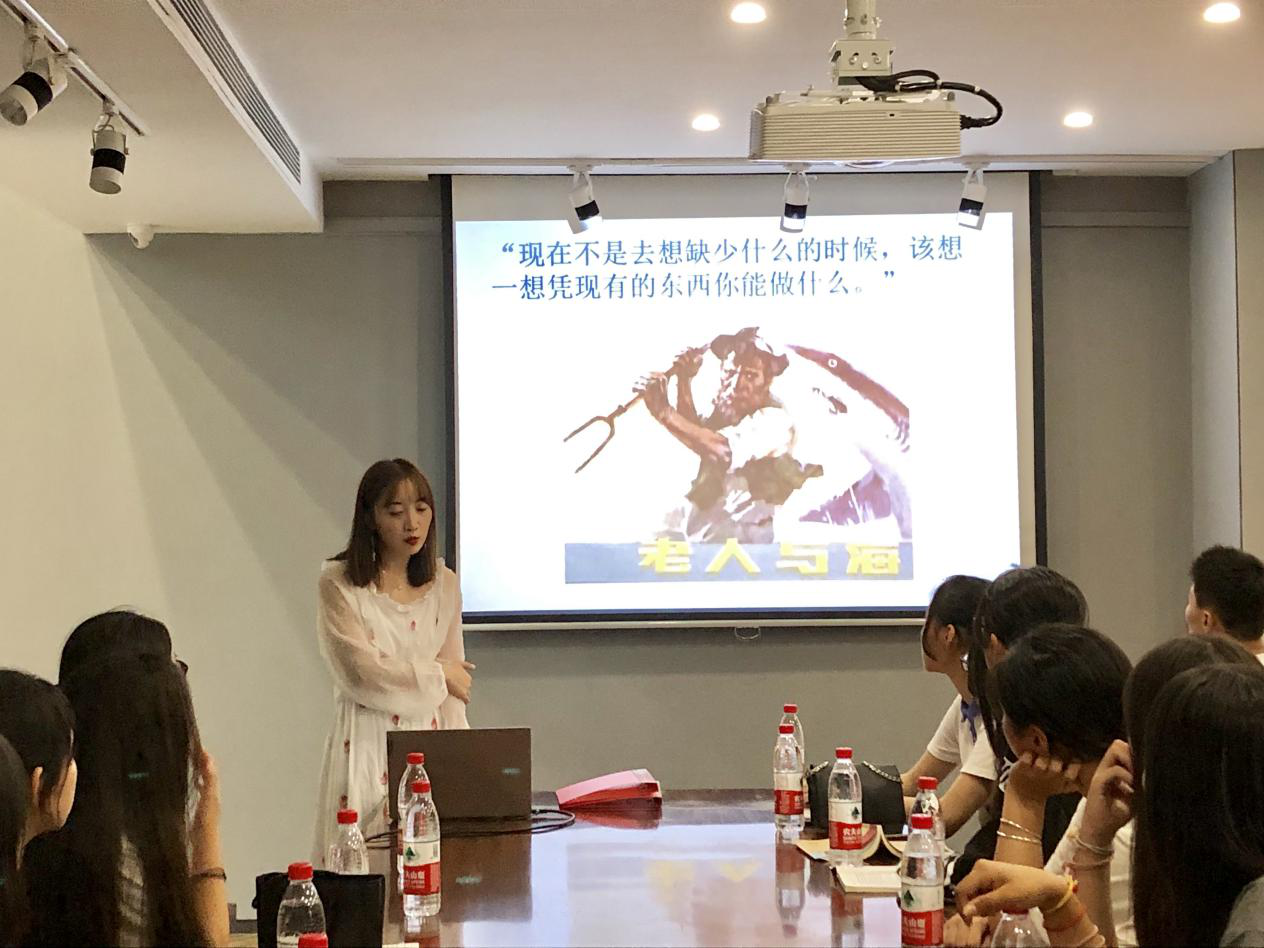 《老人與?!吠ㄟ^講述一個(gè)老漁夫的故事,揭示了人類共同的命運(yùn),給讀者帶來關(guān)于勇氣、不屈不撓、與命運(yùn)作斗爭的精神啟迪。圍繞“生而為人,請務(wù)必戰(zhàn)斗到底”這一主題,邵洋提出了“是選擇放棄,還是一往直前?”這一問題,引起在座同學(xué)的思考。隨后,她又通過解讀《老人與海》中的喻象與藝術(shù)、生命與理想,為同學(xué)們總結(jié)值得學(xué)習(xí)的寫作思路。