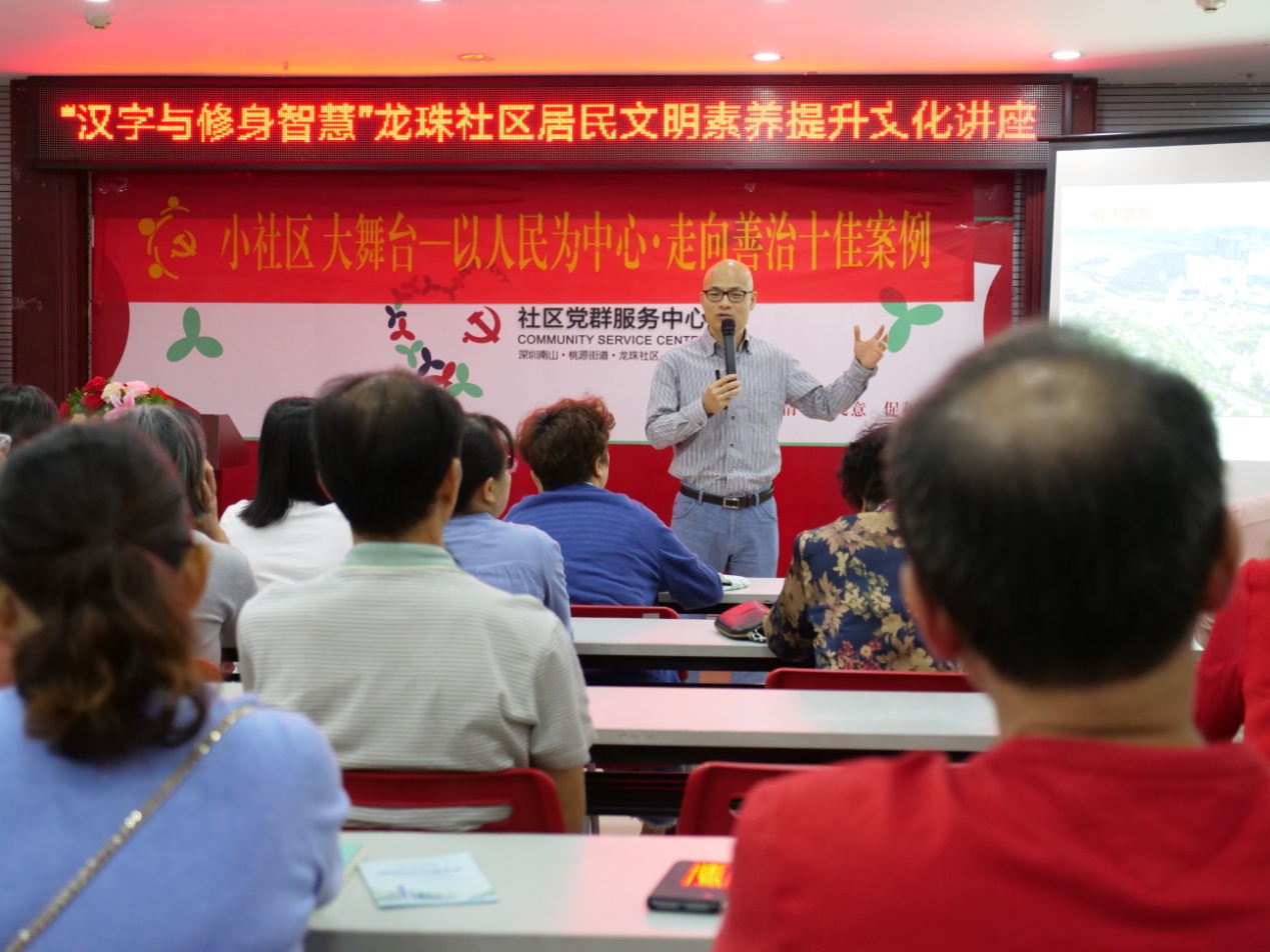 深圳新聞網(wǎng)訊 為更好地創(chuàng)建第六屆全國文明城市,以創(chuàng)新的活動(dòng)形式提升社區(qū)居民的文明素養(yǎng),11月15日上午,龍珠社區(qū)舉行了“‘漢字與修身智慧’社區(qū)居民文明素養(yǎng)提升”專題文化講座,邀請(qǐng)壹讀書會(huì)創(chuàng)始人、知名閱讀推廣人、《漢字與修身智慧》的作者劉建彪擔(dān)任主講嘉賓,從中華文明的基因(漢字)出發(fā),解讀深圳市民公約,旨在啟發(fā)居民在中華優(yōu)秀傳統(tǒng)文化的感召之下,踐行文明禮儀,用實(shí)際行動(dòng)去推進(jìn)文明城市的創(chuàng)建。