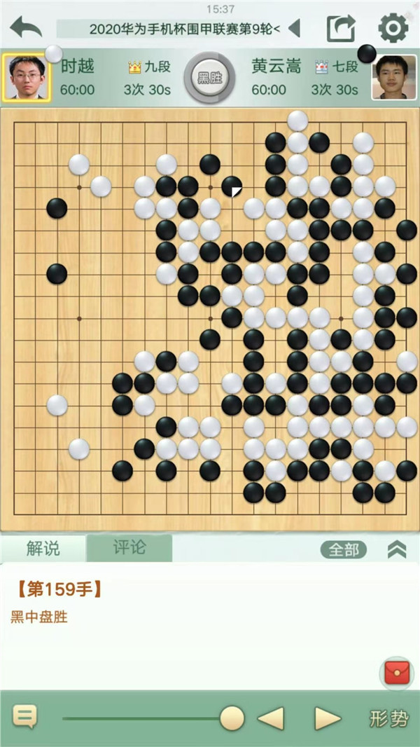 快棋臺(tái)由深圳宏發(fā)隊(duì)的時(shí)越九段執(zhí)白對(duì)陣江蘇隊(duì)的黃云嵩七段。開局一個(gè)局部黑棋應(yīng)對(duì)欠妥,白方取得大優(yōu),然而時(shí)越之后的下法不夠簡(jiǎn)明,被黑棋抓住了機(jī)會(huì),局面變得混亂。在之后雙方大龍的接觸戰(zhàn)中,白方再次放棄簡(jiǎn)明做活的下法,與黑棋大龍形成雙活,但結(jié)局是外圍厚薄損失慘重,白棋下成后手雙活之后無(wú)暇顧及下方大龍安危,被黑棋一舉擊潰。