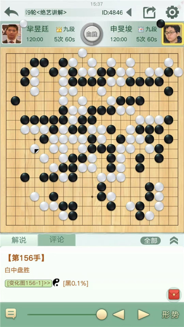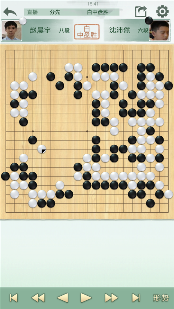 慢棋第四臺(tái)由深圳宏發(fā)隊(duì)的沈沛然六段執(zhí)黑對(duì)陣江蘇隊(duì)的趙晨宇八段。白方開局步調(diào)良好,局面小優(yōu)。中盤時(shí)黑方企圖沖擊白棋薄味,但未能找到較為有效的手段。在形勢(shì)較為不利的情況下,沈沛然選擇了強(qiáng)行開劫拼搏,但無(wú)奈劫材不夠,轉(zhuǎn)換之后繼續(xù)虧損,再難挽回局面,可以說(shuō)是白棋完勝的一局。
