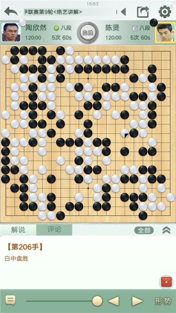 慢棋第一臺(tái)由深圳宏發(fā)隊(duì)的陶欣然八段執(zhí)白對(duì)陣江蘇隊(duì)的陳賢八段。雙方開局下出一個(gè)復(fù)雜的大型變化,局面一度兩分。序盤結(jié)束時(shí)陶欣然下出一步緩手,使得勝負(fù)的天秤向黑方傾斜。弈至官子階段,黑方下出了大意的敗招,單官?zèng)_斷白兩塊活棋,相當(dāng)于自停一手,使得白棋追回不少目數(shù)。之后黑棋如繼續(xù)收官局面仍然細(xì)微,但陳賢在出現(xiàn)失誤后心態(tài)失衡,孤注一擲殺白大龍,最終失敗,白棋幸運(yùn)獲勝。
