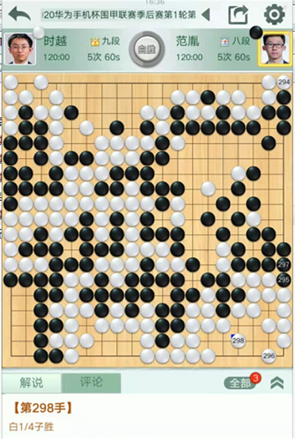 慢棋臺第四臺由深圳隊的時越九段執(zhí)白對陣民生隊的范胤八段。中盤右邊白棋進入黑空形成打劫,劫活后局面領先。中央黑棋進攻白棋時候失誤,白棋優(yōu)勢擴大。之后黑棋左邊行棋時候,白棋一直沒有脫先搶占右邊大棋,而是在左邊連續(xù)失誤并且落了后手。被黑走到右邊后黑棋大幅領先。之后右下角形成復雜的打劫,黑棋可以選擇走成三劫循環(huán)和棋后加賽,但是黑棋判斷即便放棄和棋也是局面有利。實戰(zhàn)白棋一直不補搶收官子,最終判斷獲勝時候?qū)⑷傺h(huán)變化解消,白棋1/4子獲勝。時越1/4子勝范胤。
