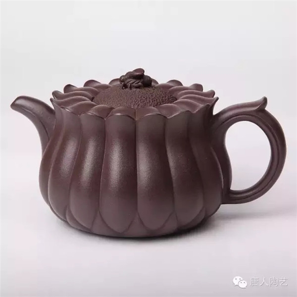 第一件,《蜂菊壺》取材于大自然蜜蜂采蜜之情形,立意新穎。壺身等分成十六瓣,俯視如盛開的菊花,蓋為花蕊,壺鈕設(shè)計成正在花蕊上采蜜的蜜蜂。顯得靜中有動,生機盎然,側(cè)視該壺,筋囊飽滿凝重,通體線條流暢,大氣中不乏精巧。菊花與蜜蜂肖形逼真,洋溢著大自然的和諧情趣。據(jù)說,唐朝霞老師為制作此壺,多次徘徊在桃花林里、菊花叢中,觀察蜜蜂的神態(tài),巧妙地讓蜜蜂造型躍然“蜂菊壺”壺鈕上,靜中寓動,令人叫絕。