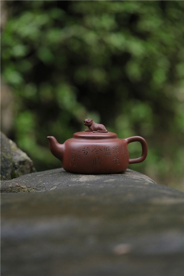 第四件,《臥虎藏龍壺》為平蓋、方肩、圓底,造型敦厚,穩(wěn)重古樸。壺鈕塑以遠眺的臥虎,壺底則暗藏浮雕團龍。兩者相向呼應(yīng),于平淡中藏奇趣。
