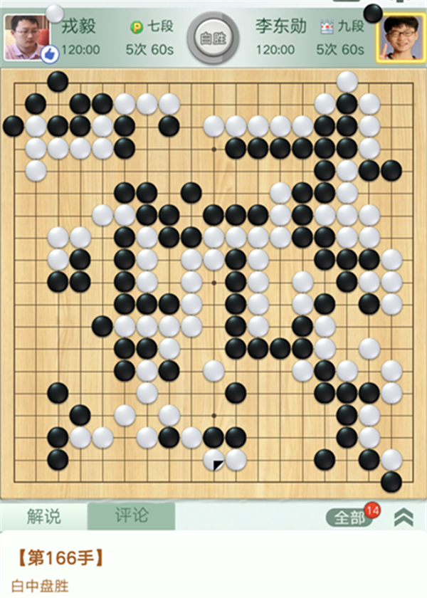 龍華隊戎毅七段本輪重新披掛上陣,執(zhí)白對陣韓國排名第四的李東勛。開局二十幾手時,黑在左上出現重大失誤,白棋大幅領先。之后,白思路清晰,掌控局面,優(yōu)勢逐漸擴大,而速勝。