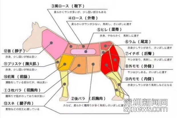 馬能做成刺身的部位相當(dāng)?shù)挠邢蓿勒沼突ǚ植即笾驴梢苑譃楦谷?卜口)、霜降、赤身等不同的等級(jí)。其中最稀有的的“三枚腹”肉,一匹五百公斤的馬只能產(chǎn)出大約5-6公斤,肉質(zhì)口感近似于藍(lán)鰭金槍魚中腹肉。