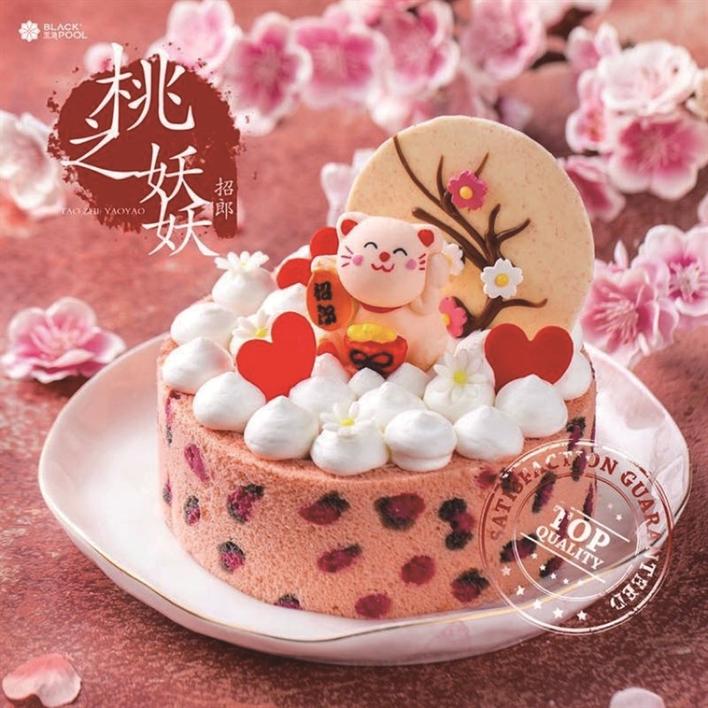 據(jù)黑池產(chǎn)品經(jīng)理介紹,“招郎蛋糕”是黑池最近重磅推出的新產(chǎn)品。蛋糕周圍覆盆子果干點綴而成的粉色豹紋,讓整個蛋糕充滿了野性魅惑又不失少女甜美。最為吸引眼球的,則是蛋糕表面,被桃花簇?fù)碇囊恢弧罢欣蛇鳌?。這只軟萌可愛的“招郎喵”,象征著,對得到這款蛋糕的人,最美好的祝愿,希望他們能夠遇到最好的愛情,找到心目中的那個他。