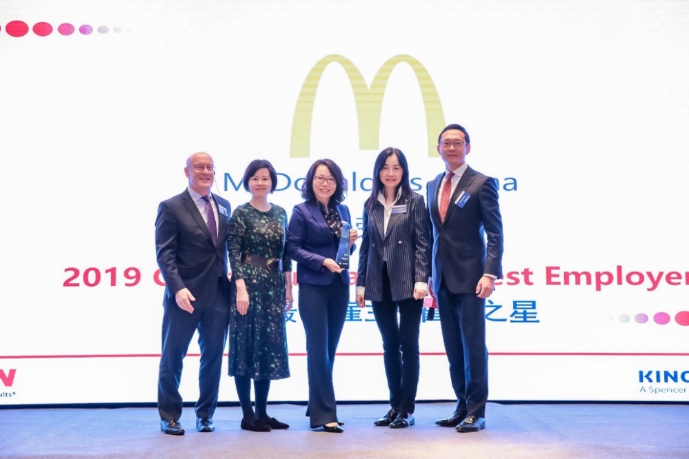 麥當勞中國首席人員官王艷偉(中 )代表公司接受2019“怡安中國最佳雇主”稱號