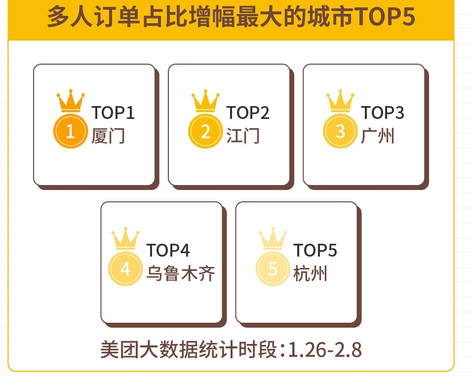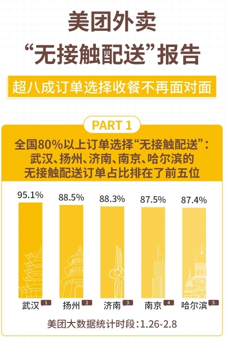報告顯示,在1月26日至2月8日期間,在使用“無接觸配送”服務(wù)占比最高的城市中,武漢、揚州、濟南、南京、哈爾濱排在了前五位。從用餐人數(shù)來看,2人份及以上餐食占總體訂單的比例相比較平時增長了31.7%。采用“無接觸配送”的訂單占到了整體單量的80%以上,且每一單外賣都使用“無接觸配送”服務(wù)的用戶占到66%。
