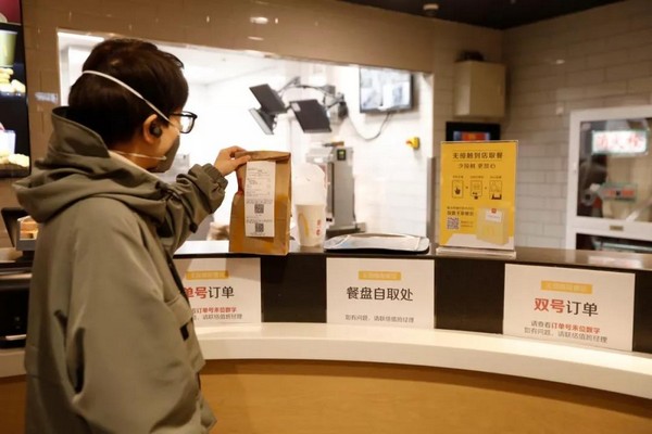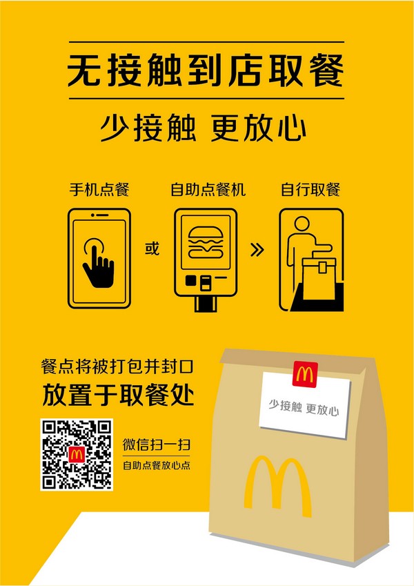為了讓顧客放心,麥當(dāng)勞在安全服務(wù)的前提下,餐廳實(shí)施“無接觸配送”和“無接觸到店取餐”。所有外送訂單均附上“麥樂送放心卡”,標(biāo)注生產(chǎn)、配膳、外送人員姓名及體溫,做到餐品、人員可追蹤。顧客可選擇讓外送員將餐品送到指定位置取餐,在手機(jī)、餐廳自助點(diǎn)餐機(jī)或柜臺(tái)點(diǎn)餐后,無論堂食或外帶,員工都會(huì)將制作好的餐點(diǎn)裝入打包袋并封口,放置到取餐處。