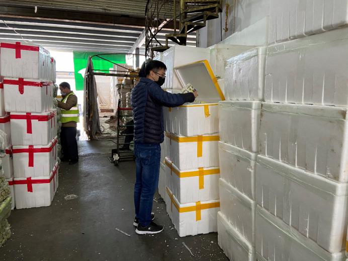 市場的檔主、物流車司機、加工工人,全部都帶上口罩,看新聞講跟人講話要保持距離,但忙起來真顧不了那么多,大家都在“搶貨”,這頭跟檔主商量好,那頭貨可能被拉走了?!柏浺阶约旱募庸ぶ行?,才算是你的?!币驗榇汗?jié)批發(fā)市場的檔口工人回去一大半了,沒人送貨,緊張的時候,有女同事干脆自己借一輛三輪車,把談好的貨源直接拉走。