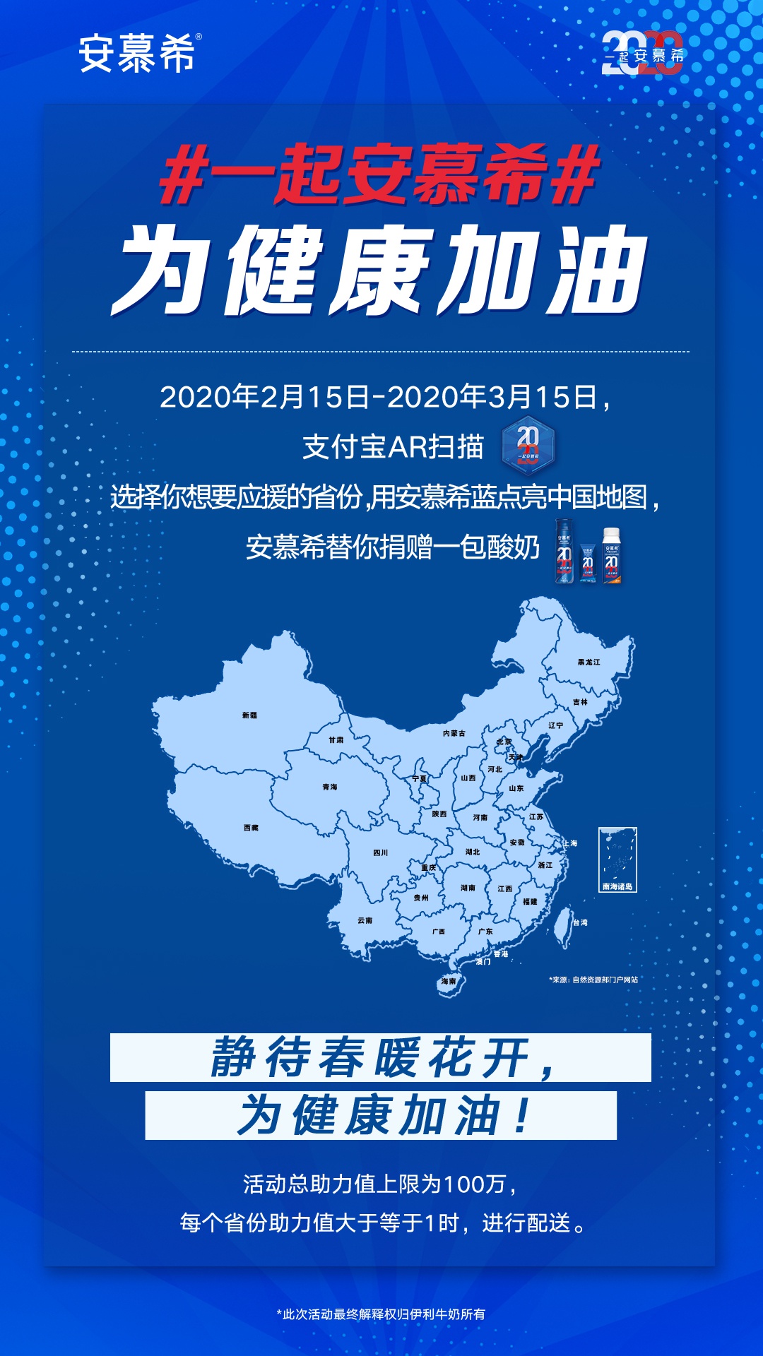 從2月15日起,安慕希發(fā)起“一起為健康加油”公益活動(dòng)。消費(fèi)者每成功通過支付寶AR掃描安慕希2020標(biāo)志,并為支持的地區(qū)點(diǎn)藍(lán),安慕希就會(huì)為抗疫一線人員送出安慕希產(chǎn)品,將愛心化為實(shí)際行動(dòng),為戰(zhàn)疫一線加油。