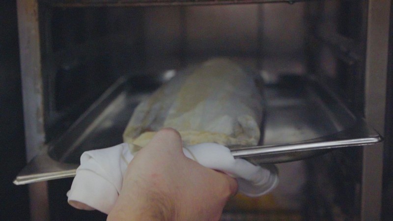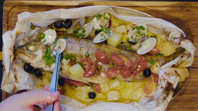 清蒸鱸魚是常見的粵式吃法,本期,四季酒店主廚畢柏克為吃貨們帶來別樣的鱸魚吃法——“烤紙包鱸魚”。他將魚進行腌制后,用烘焙用紙裹緊,在烤爐中烤制40分鐘。吸收了海鮮文蛤、白葡萄酒精華的魚肉緊實鮮嫩,在打開外包紙的那一刻,香氣四溢,讓人欲罷不能。如此烹法,也能最大限度保存魚的營養(yǎng)和鮮美。