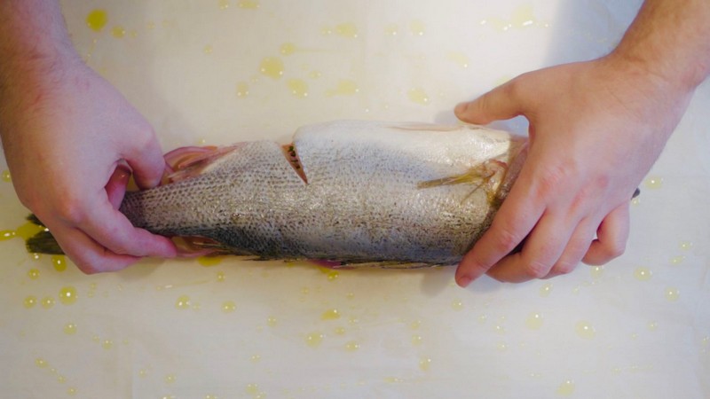 5、185℃預(yù)熱烤爐后,將鱸魚放入烤箱中烤制45分鐘;