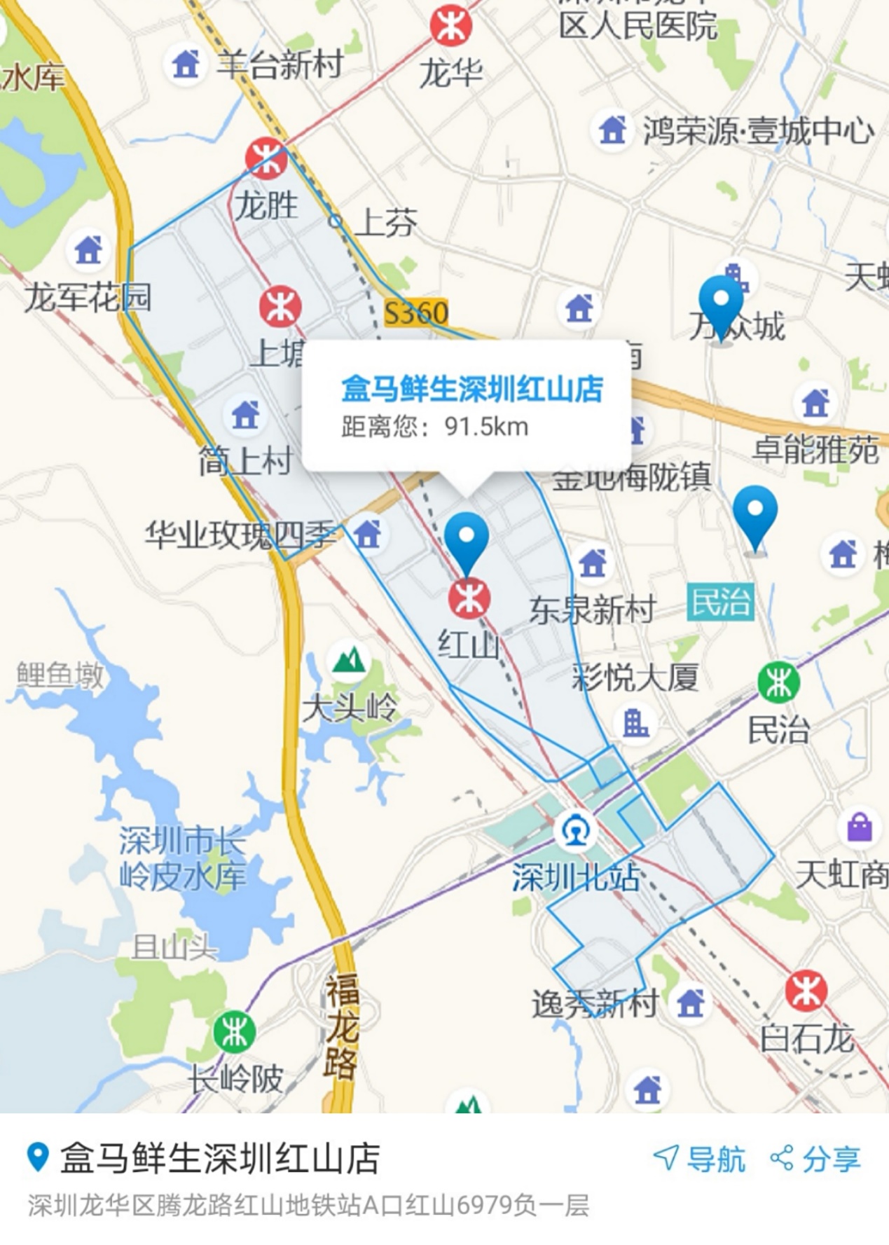 近年來(lái),隨著深圳發(fā)展重心北拓、深圳特區(qū)一體化進(jìn)程加快,即便是在傳統(tǒng)意義上的深圳關(guān)外,在盒馬紅山店的配送范圍內(nèi),已經(jīng)有一家沃爾瑪、兩家華潤(rùn)萬(wàn)家等大賣場(chǎng),還有十幾家錢大媽和一個(gè)農(nóng)貿(mào)批發(fā)市場(chǎng),各類線下零售和社區(qū)買菜業(yè)態(tài)也在該區(qū)域快速發(fā)展。