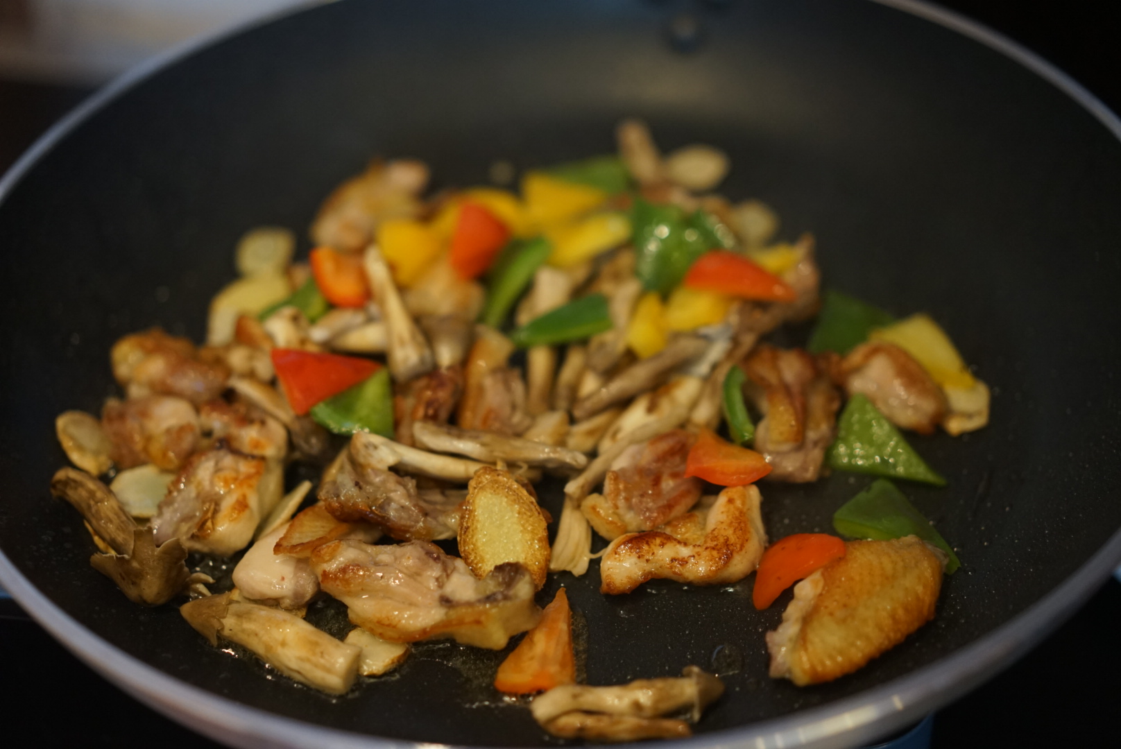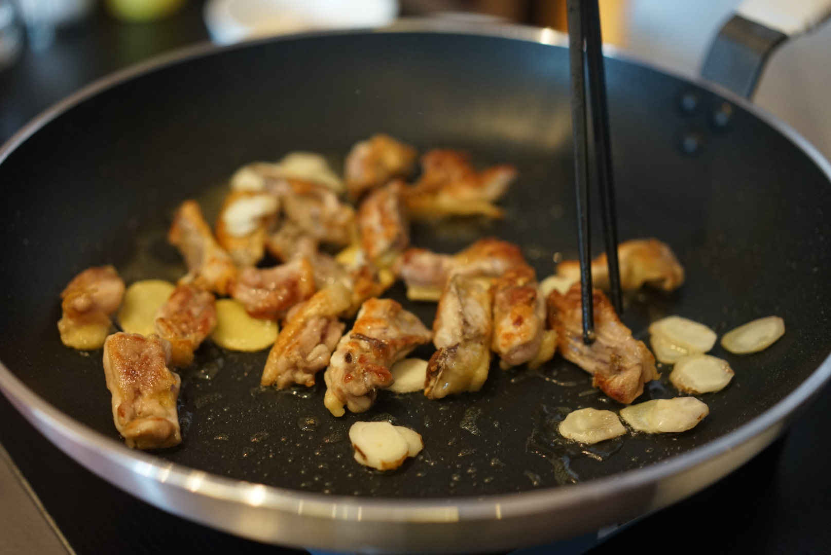 3、等雞肉大約7成熟時(shí),加入沙姜片,用鐵勺輕輕兜炒雞肉與姜片,讓雞肉更加充分吸收姜的風(fēng)味。雞皮經(jīng)油溫加熱后,油脂滲出,將鍋中的油勺起,再淋到雞件與姜片上,充分融合。